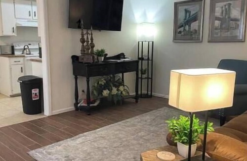 Kick back and relax in this newly remodeled calm, stylish space. Enjoy great mattresses, sheets and pillows! Set up for a relaxing getaway. This 2 bedroom duplex features a king bed with flatscreen fire tv in the master. The second bedroom has a queen bed for your comfort. The bathroom has a tub/shower, lighted makeup mirror, hair dryer and great linens . The kitchen has what you need for a great cup of coffee or a glass of wine or quick meal. Garage, 2 lounge chairs and charcoal grill..