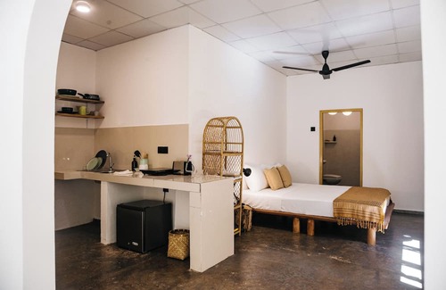 Located in Hiriketiya, this house is a dream. The cozy bedroom features a nice full bed, perfect for a good night's sleep. With WiFi and AC available, guests can stay connected and comfortable. The additional living room space offers a pleasant spot to relax or accommodate an extra guest on the large sofa that can be converted into a twin bed.
