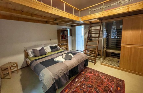 "family & bike + sauna", 2-room apartment 65 m2 on 1st floor Living/sleeping room with 1 bed, 1 double bed, dining table and satellite TV. 1 room with 1 double bed. Open gallery with 2 sleeping facilities. Kitchen (oven, dishwasher, 4 ceramic glass hob hotplates, kettle, microwave, freezer) with dining table. Shower, shower/WC, sep. WC with corner bath, Sauna. No view. Facilities: Internet (WiFi, free). Reserved parking at the house. Please note: suitable for families apartment courtyard side. Non-smokers only. Available: cellar. Instead of an enclosed bedroom, some sleeping areas are located in an open-plan area (gallery, alcove, etc.).
