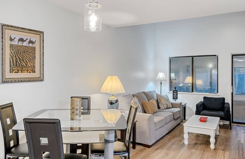 the living area offers a sunny spot to kick back and unwind after the day's adventures, with a smart tv equipped for streaming your favorite shows and movies Stainless steel appliances shine in the full kitchen and there's plenty of seating between the breakfast bar and adjacent dining table. Additional essentials include central air-conditioning, free WiFi, and a private washer/dryer.