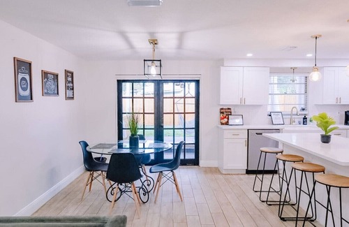 Discover this charming home with 2 cozy bedrooms, a chic bathroom, and a queen sofa bed for extra sleeping options. The open-concept design creates a warm, inviting atmosphere with modern decor. Relax in the game room featuring a foosball table and projector or enjoy the spacious fenced backyard, complete with charming outdoor furniture. Perfect for recharging after a beach day, this retreat offers a blend of indoor comfort and outdoor enjoyment for your stay.