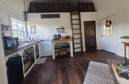 farmhouse decor , covered porch with rocking chairs, extra open loft bedroom , outside fire pit, bbq grill, fenced backyard and plenty of outdoor space to explore We are close to town for all your needs but far enough out to feel away from it all. It is fenced and set apart from the other tiny home on the property.