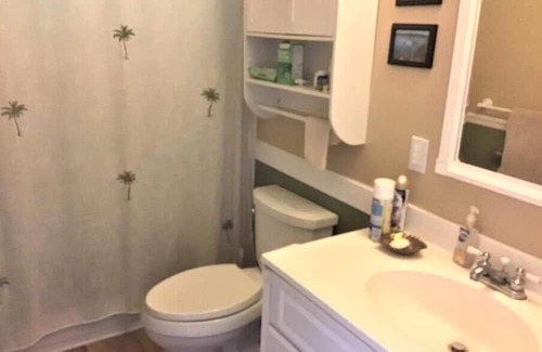 the lake house, which has central air conditioning, has four bedrooms and a loft above the living room (which has four single beds for children only) The downstairs has two bedrooms (each with a king-size bed), a bathroom with a walk-in shower, a half bath, a laundry room and a small game room with a TV and a bundle of games and books. The upstairs features a large living area with a big TV, a kitchen (which has all the amenities and utensils), a bathroom, and two bedrooms with queen size beds.