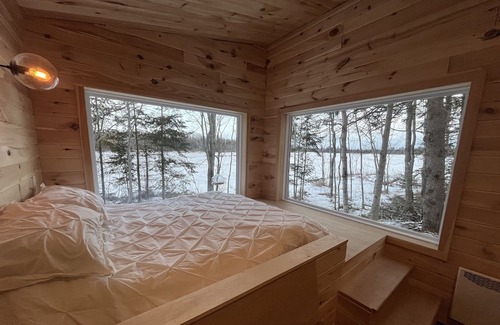 Cozy tiny house with a view on the river. Perfect getaway to relax and diconnect in the nature. 5 min. from all amenities. Queen bed in the window and double bed up the ladder, full bathroom, Wood stove and AC..