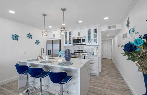enjoy breathtaking bay views from this privately owned, fully renovated suite in tampa It features a fully equipped kitchen with all the essentials, including a fridge, stove, microwave, and silverware.