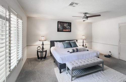 It is a 4 large spacious king bedroom house with digital TVs installed in all 4 rooms. There are 2 additional living areas with relaxing furniture and digital TV in all rooms and common areas. The entire property is equipped with 1Gps google high-speed fiber line internet, and connected to all TVs. "3 full bath, one new modern full bath on the main level"