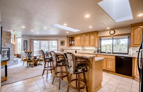 inside, cozy up by one of the gas fireplaces or indulge in a luxurious soak in the jetted tub With high ceilings and abundant natural light, the spacious interior blends classic cabin decor with rustic wood paneling and modern amenities. The main level features a huge eat-in kitchen, ideal for preparing meals to enjoy in the formal dining room. An ornate staircase leads to the lower level den, complete with multiple sitting areas and a bar, offering a cozy space to unwind.