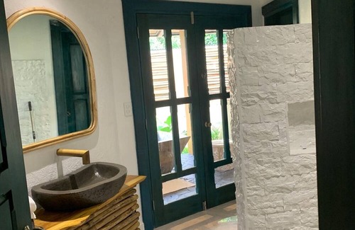at villa amuntai, you'll discover a haven of relaxation featuring a sparkling swimming pool with a cascading waterfall, a soothing hot jacuzzi, and a sunken sofa for ultimate comfort Each of the villa's two bedrooms comes with its own private bathroom and toilet, plus an additional outdoor bathtub for an indulgent al fresco bathing experience.