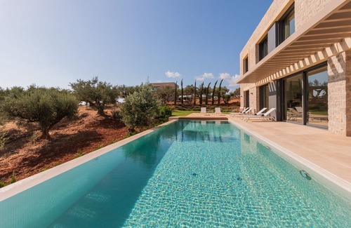 Villa Coral presents a meticulously planned outdoor environment, incorporating a private pool, a pergola-covered lounge, and a designated dining area. It has 4 bedrooms with ensuite bathrooms, a spacious living room, and a fully equipped kitchen. Its unparalleled hilltop location imparts a sense of absolute privacy, as it is strategically positioned within the heart of an olive tree grove.