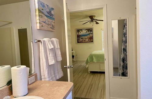 as a delightful bonus, the property includes a golf cart, adding a dash of fun to your stay The kitchen is a modern marvel, boasting new appliances, countertops, and a chic backsplash, while the bedrooms offer ample space, each adorned with a plush queen-size bed and a personal TV for added comfort.