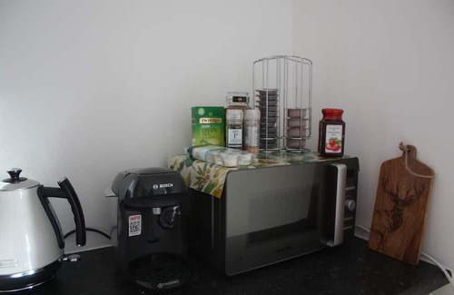 it has one double bedroom, a shower room, and compact living space with sofa, dining table and kitchenette, parking and your own grass area with table and chairs to enjoy the bird song and peaceful surroundings (Please note there is no oven, but there is a microwave, fridge, toaster and coffee machine). The sink is located outside the door in the car port..